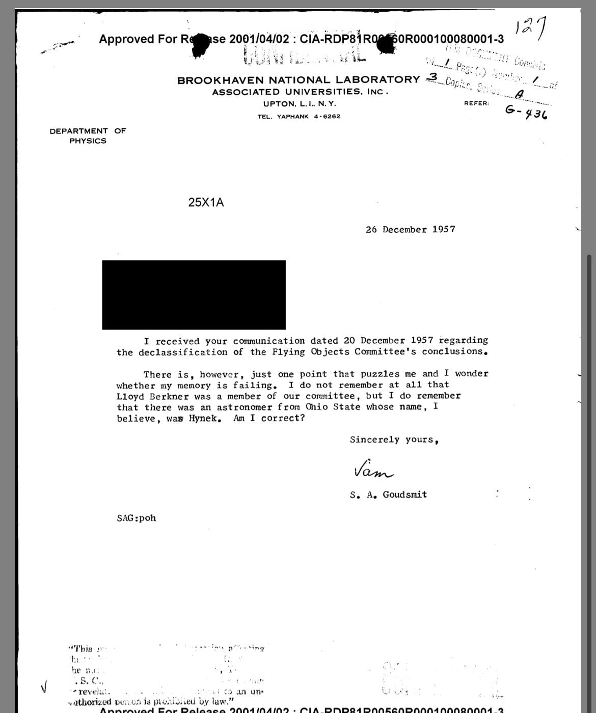 The government had publicly closed the subject in 1969.